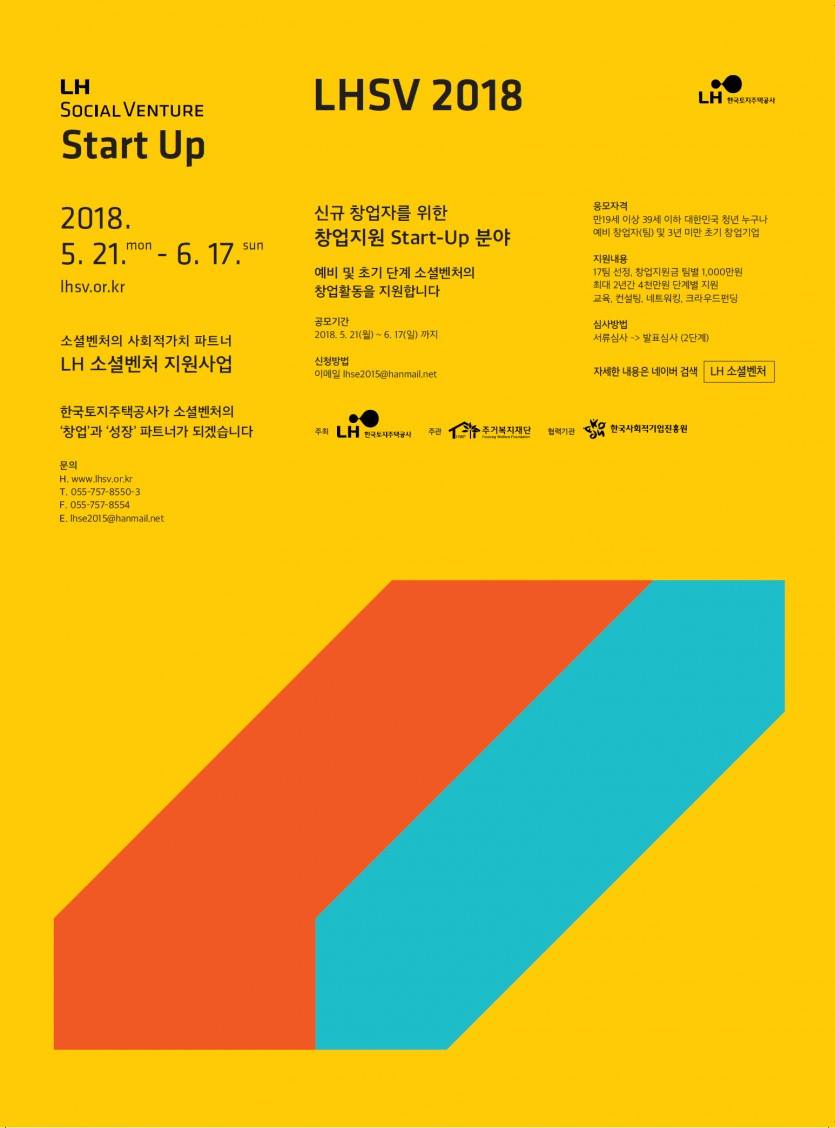 <LH>와 <주거복지재단>이 사회적가치를 추구하는 예비 창업자(팀) 및 3년 미만 초기 창업기업을 대상으로 창업활동을 지원하는 <LH 소셜벤처 창업지원 사업 Sart-up> 설명회를 개최합니다. 일시: 2018년 6월 1일 오후 3시 장소: 서울도시재생지원센터(중구 무...
