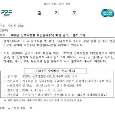 「2026년 신축약정형 매입임대주택 매입 공고」 1. 경기도에서는 도 내 저소득층 및 청년, 신혼부부의 주거...